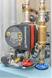 热电联产的原理可使CHP效率达到最高值。最终,与其它发电形式相比,系统可节省一次能源耗量,并能够减少CO2的排放量。此经济性电厂本身由天然气和生物甲烷的混合物供电。CHP可产生20 kW的电能和45 kW的热能。容量为1000升的大型储罐用作热水的缓冲蓄水池。如果加热阶段需要更多热能,则系统可使用额外的冷凝锅炉。