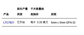 LTC7821 采用 5mm x 5mm QFN-32 封装。扩展和工业温度版本可在 –40°C 至 125°C 工作。如需更多信息,请登录 。