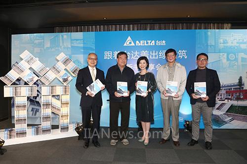 台达品牌长郭珊珊 (中)、原中国可再生能源学会理事长石定寰(左二)、国家住宅工程中心副总建筑师曾雁(右二)、、美国绿色建筑委员会北亚区董事总经理杜日生(左一),《跟着台达盖出绿建筑》主笔高宜凡(右一)在新书发表会上人手一本《跟着台达盖出绿建筑》,期待与读者分享台达过去十年来在全球打造绿色建筑所累积的建造过程以及节能经验完整呈现