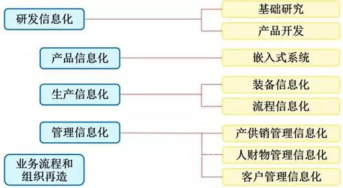 制造业信息化的发展,主要是围绕着企业的业务运行而展开。首先是企业内部信息化,见下图。这包括“四化一再造”,也就是研发信息化、产品信息化、生产信息化、管理信息化以及业务流程和组织再造。其中产品信息化,主要是指带有嵌入式系统的产品,其复杂程度各不相同。理解产品信息化,对理解当下的智能制造,非常重要。