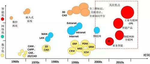 企业智能化的发展,可以回溯到上个世纪六十年代初。通过下图的制造业智能化发展,可以看到制造业如何从数字化走到网络化,再走到智能化。