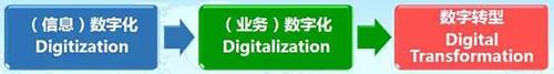 理解数字转型的意义,与一个非常重要的问题有关,那就是看待全球信息化发展阶段的另一个视角。这种视角认为,全球信息化的发展历经了以下三个不同的阶段。2012年,IBM的伯尔曼(Saul J. Berman)首先提出了数字转型的概念;2016年,卡恩(Shahyan Khan)在他的一篇文章《数字时代的领导力——数字化对高层管理领导力的影响研究》中指出,人类拥抱数字化的进程可以分为三个阶段,即:信息的数字化(Digitization),业务的数字化(Digitalization),以及数字转型。