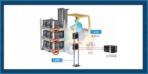 如果1台读写器的通信范围不够大,最多可使8台读写器像1台读写器一样进行通信的功能。例如,在统一检测层叠的托盘时,由于设置的RF标签多,所以需要上下宽广的通信范围,但通过纵向安装多台读写器,可以覆盖需要的通信范围。此时,上位设备只需向1台主读写器发送指令,即可进行通信。