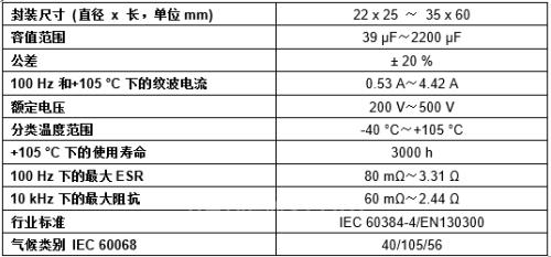 新发布的电容器的纹波电流高达4.42A,这样设计者就可以使用更少的元器件,达到节省电路板空间,降低成本的目的。电容器在105℃下的使用寿命长达3000小时,如果电容器的环境温度是60℃,可以使要求苛刻的应用产品的使用寿命达到10年以上。