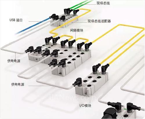 当在高信号密集区使用时,模块可以极端紧凑的方式安装在一起。I/O模块之间通过数据线(系统总线)和电源线连接。如果需要较大电量或者模块之间距离较大时,可以使用电源分配器作为供电补充。根据现场总线类别,通过集成的USB接口和现场总线接口执行配置、编程、维护以及诊断功能。