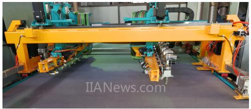 在双驱底座之上是切割机设备的横梁,横梁上配置了两套独立的Y轴,分别驱动左右切割工作区的Y轴方向的运动,每套Y轴悬挂一个X轴基座,每个基座配置8个旋转轴,控制切割刀的切割方向。单台设备共使用24台伺服电机用来实现设备的运动控制。该设备配置了16把切割刀,这些切割刀可以在系统的插补控制下,准确地同步工作,切割出或简单或复杂的形状,极大地提高了切割效率。