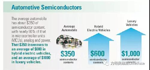 现在随着电子设备被用以控制车辆功能的比例越来越大,很明显的是,防止危险的过电压和过电流所需的电路保护器件将被迫快速演化,以跟上从机械/液压/电气系统到本质上是车轮上的超级计算机的转变。如今,普通的汽车包含大约 350 美元的半导体成分,在微控制器单元(MCU)、模拟和电源中占其中的近80%。在混合动力汽车中,所含半导体的成本则升至 600 美元,而豪华汽车的更是高达 1000 美元。