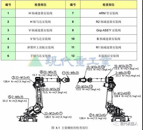 为了让机器人长时间保持较高的工作性能、必须对其进行检查。检查分为日常检查和定期检查两种。日常检查、清理污垢和灰尘,检查电机、减速齿轮是否有不正常响声等。而定期检查的基本周期、检修员应当根据所示的周期对机器人进行检查。每运行 35,000小时后进行一次大修。