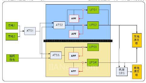 在通信 IDC 机房中采用大功率6 脉或12 脉UPS 时,为消除谐波,避免UPS 产生的谐波相互相影响,选用台达 PQC 系列模块化APF 对UPS 谐波进行部分负载终端就地治理的方案,APF 谐波滤除范围为2~50 次,谐波治理率能够达到97%,且具有模块化,体积小,安装方便,便于后续扩容的巨大优势。
