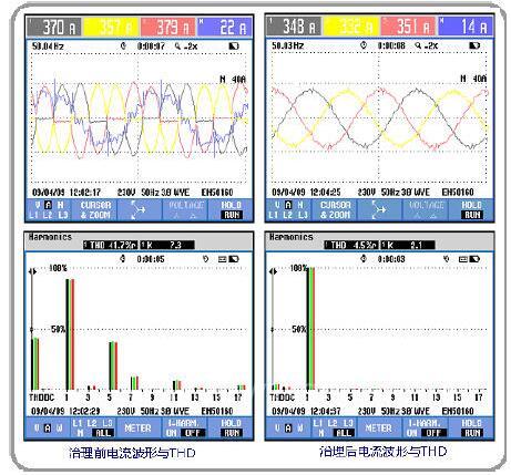 PQC 投入前后电流波形与THD 如下图所示。