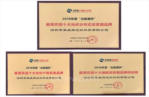 10月25日,2018年度“北极星杯”最受欢迎十大光伏品牌颁奖盛典在北京西国贸大酒店隆重举行。本活动是由北极星太阳能光伏网连续举办的第七届评选活动,经由多方投票竞选,英威腾光伏顺利获得2018年度“北极星杯”最受欢迎十大光伏户用系统品牌、最受欢迎十大光伏分布式逆变器品牌及最受欢迎十大储能逆变器品牌供应商。