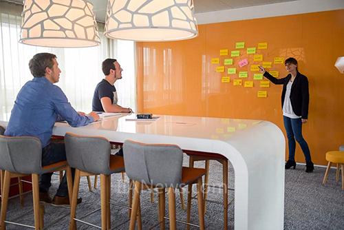 这样的环境吸引人们参与到创新性的工作中,许多墙壁可以直接涂写,或带有磁性。对于大型团队来说,项目区是理想中的会议场所。此外,还有众多可供2至3人使用的小型会议室和休息区,无需预订可以随时使用。