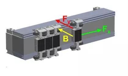 由于轨道后的线圈会产生磁力,与滑块的永磁体产生水平方向的排斥力推动滑块的运动—这与伺服电机原理一致,只是这个是切开的伺服电机,而且,与普通直线电机不同在于它的滑块数量是非常多的,由贝加莱提供的SuperTrak轨道最大可以达到50米长,而滑块间距可以在200mm左右分布 ,而最新的ACOPOStrak已经规划的单个项目可以达到320米长度,500个滑块,滑块最小间距50mm。