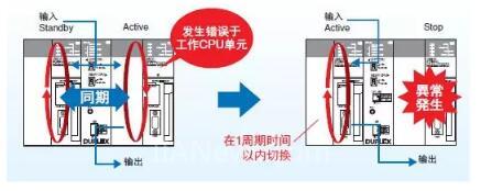 CPU单元内的程序或内部数据在活动/备用CPU之间完全进行自动传送并进行同步。无需选择要同步的数据或单独进行传送。因此在工作CPU单元发生错误时,控制会立即切换给备用CPU。(1周期时间以内)
