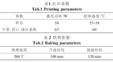 各部分的加工参数见表 1。将 3D 打印的预成型产品放入烘箱中烘烤以使其强度满足浇注要求。 为了防止在烘烤时发生变形,将砂型周围埋上细小的玻璃珠。 表 2 为烘烤参数。