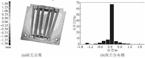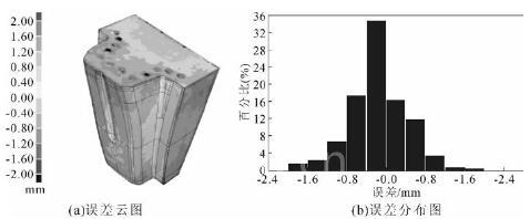 图 10 所示为 3D 打印设备打印制作以及烘烤完成的砂芯以及砂型。打印制作的砂型的尺寸精度直接影响最后得到的铸件尺寸精度。 使用三维扫描仪对打印得到的各部分砂型进行扫描测量, 将测量所得的点云数据与三维 CAD 数据进行精度比对, 确定砂型的制作误差。 图 11 为砂芯的精度比对结果,可以看出砂芯的整体制作误差在 1.5 mm 以内,根据误差分布图以及误差云图显示结果, 随形水道部分对应的砂芯制作误差在0.75 mm 以内 , 且大部分误差在0 . 30 mm 以内。 由于砂芯部分对应铸件的随形水道部分, 而最后随形水道位于铸件内部无法测量其尺寸精度, 所以此时测量的砂芯精度可以为最后铸件内部的随形水道尺寸精度提供参考。