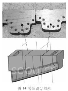 图 14 为铸坯剖分结果,根据剖分结果可以看出,内部冷却水道完全成形,并没有水道堵塞的情况出现, 且模具内部不存在铸造缺陷。