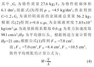 浇道横截面的面积比取∑F直∶∑F 横∶∑F 内=1∶1.2∶1.5,直浇道为阻流面,根据以下公式计算阻流面面积以及浇注时间:
