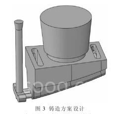 依据计算得到的浇注系统以及冒口尺寸,铸造方案设计如图 3。 将设计的铸造方案 CAD 数据转化为有限元网格数据文件后,用 procast 铸造模拟软件对铸造方案进行计算