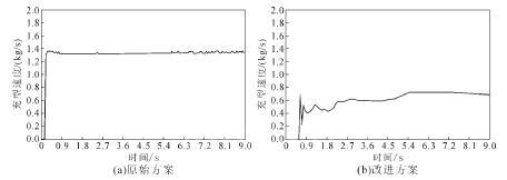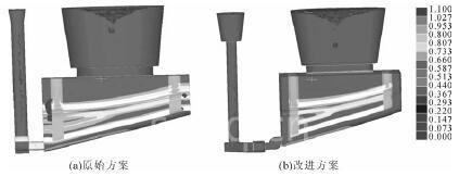 腰圆形冒口形状的设计, 可以起到标准圆形冒口相应的补缩作用, 图 5 所示为两种冒口设计中计算的最后凝固位置, 以看到最后凝固位置都位于冒口中。由于腰圆形冒口与模具形状相对应,可以减少冒口质量从而提高工艺出品率。通过比较计算结果中钢液流经内浇道时的速度, 可以发现在内浇道横浇道上做缓流设计可以减少钢液进入铸件的速度。