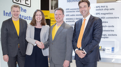 文字说明:期待合作伙伴关系:HARTING Electronics全球产品管理总监Frank Welzel; TE Connectivity通信与电力总监Monika Kuklok; HARTING Electronics董事总经理Ralf Klein;以及TE Connectivity工业通信全球产品经理Eric Leijtens(从左至右)。
