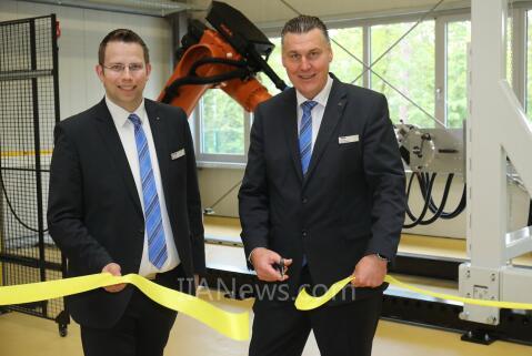 文字说明: 浩亭定制化解决方案(HCS)总经理Christian Schumacher(右)和全球项目工程主管Matthias Wiehe正式调试机器人。