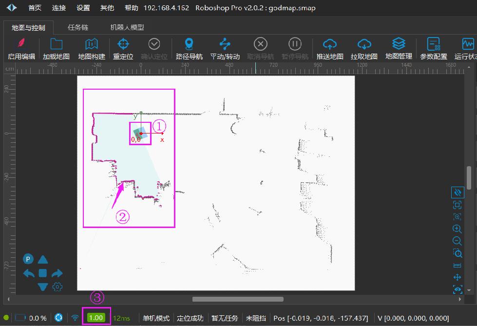 注:使用此功能,机器人当前所加载的地图与软件当前所使用的地图必须保持一致;机器人位置正确时,不需要使用【重定位】功能