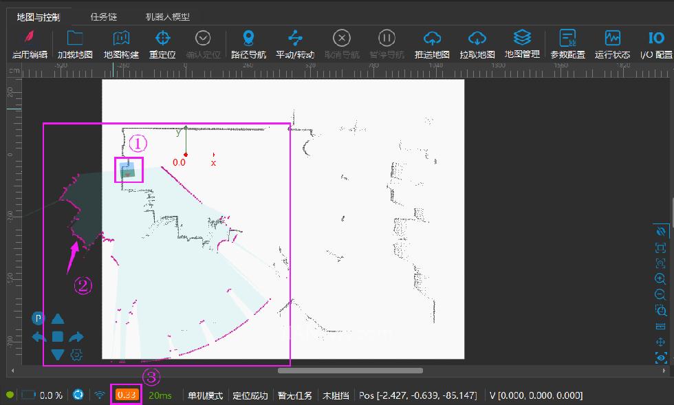 打开软件,成功连接机器人后,进入【地图与控制】界面,我们可以看到当前机器人的在软件地图中的位置,激光匹配度和其当前所处位置的置信度,如上图所示: