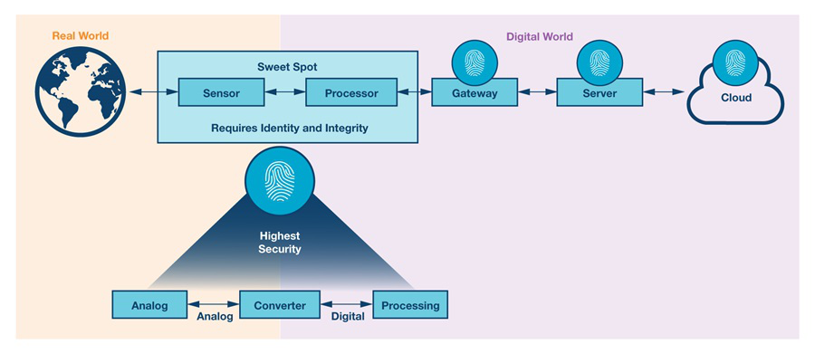 ADI认为要保证数据的安全性,安全功能应当尽早实施,最好是在系统信号链开始的时候,也就是从实际的物理世界转向数字世界的时候。这个期间就是“最有效点”。这个最有效点要求高度有效的数据完整性和硬件身份识别,如此才能实现最高级别的数据安全性,使得操作系统对数据安全有信心。在硬件级别实现身份识别和完整性,即将保护特性嵌入硅片中,是产生适当数据安全性的最有希望的方法。这就是所谓信任根开始的地方。