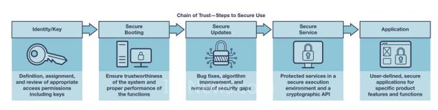 信任根是一组相关的安全功能,其将设备中的加密过程作为一个很大程度上独立的计算单元加以控制。为实现安全数据传输,通常要按顺序一环套一环地执行一系列步骤,控制硬件和软件组件。各个步骤的顺序确保数据通信按照期望无害地进行。所有这些安全功能都应放在单独的受保护执行环境中,与设备的实际应用分开,保证代码中没有可能导致设备间接损坏的错误。
