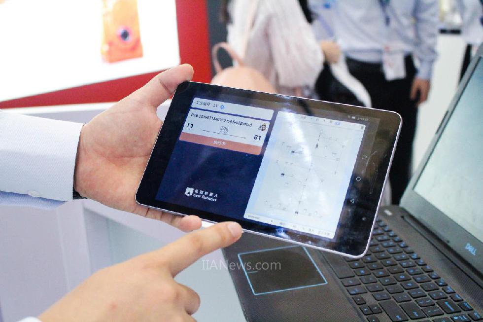 现场观众可以看到,展台旁边的操作员通过手持PDA进行呼叫,机器人便可接收指令,将装有“汽车发送机”或“变速箱”从地面的库位运输至展台,再由其他机器人运输至操作员身旁,实现货到人的无人化运输。在展台显示屏,还能实时监测机器人运动场景与全局物流状况。