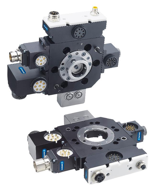 SCHUNK SWS-046 气动快换系统可快速、可靠地在机器人前端实现各种机械手和工具的更换。其有四种可选的模块安装接口,为连接气动、液压或电动执行器提供了高功率模块、自密封流体模块和伺服模块等可选项。另一项独特的优势是,配备各类可连接电动执行器和传感器的模块。例如,雄克提供了 PROFIBUS、PROFINET、CAN、RS232 和 EtherNet TCP/IP 模块,可接收来自诸如电动机械手或力/力矩传感器的信号。电路通道可根据应用模块化调节。
