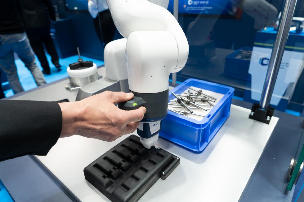 协作机器人的前端配备有针对特定应用设计的 SCHUNK Co-act 机械手,满足 EN ISO 10218-1/-2 和 ISO/TS 15066 的要求,实现与人类的安全互动。所有的调节和电力电子装置都集成在机械手内部,不会占用控制柜内任何空间。其界面和尺寸及干扰半径均单独适应雄克的应用。除了针对特定应用的 Co-act 机械手之外,雄克还提供协作应用的标准机械手系列,包括 SCHUNK Co-act EGP-C,经 DGUV 认证的小型机械手,以及即将推向市场的SCHUNK Co-act EGL-C 长行程机械手,后者将是雄克机械手首次在人机协作应用中达到 450 N 的抓取力。