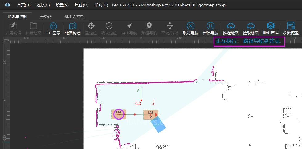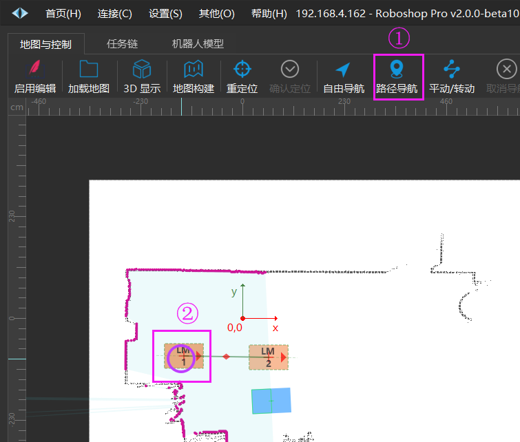 点击模块工具栏中的【路径导航】①,然后点击一个站点,如点击LM1点②,机器人会进行路径导航沿着线路运行到目标点(LM1点),且机器人到点的朝向与站点朝向一致: