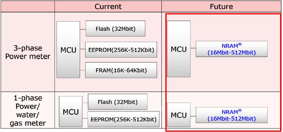 如上文提及,富士通FRAM已经能够满足智能表计应用的各类需求,但富士通已投入开发与试产下一代高性能存储产品——NRAM。NRAM是富士通与Nantero公司协议授权后,共同打造的下一代颠覆性新型存储器,因为它同时继承了FRAM的高速写入、高读写耐久性,又具备与NOR Flash相当的大容量与造价成本,并实现很低的功耗。以智能表计方案为例,使用一个NRAM就可以替代电、水、气、热表中的Flash、FRAM和EEPROM等所有存储单元,不仅减少了存储器的使用数量,也有利于系统工程师简化设计上的难度。