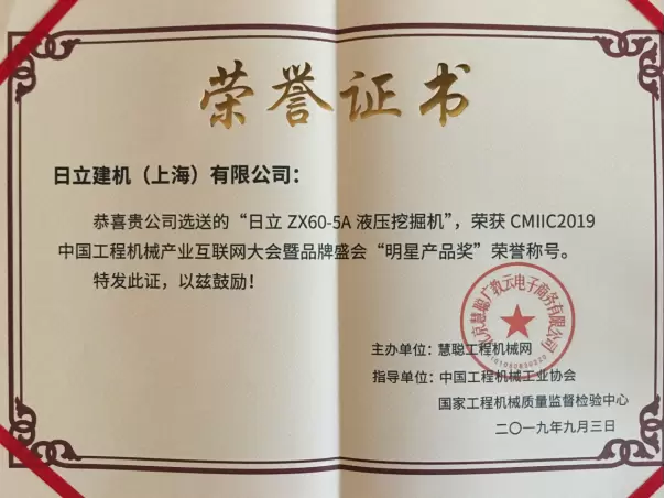 2019年9月3日,CMIIC2019工程机械产业互联网大会暨品牌盛会(以下简称CMIIC2019)在京隆重举办,政府及协会领导、行业专家、优秀厂商、专业用户再聚首,共同展望中国工程机械行业的未来,并见证年度明星产品榜单的重磅发布。凭借多领域、精细化的创新与市场开拓,日立建机ZAXIS60-5A液压挖掘机荣获明星产品奖,日立建机(上海)有限公司营业统括本部徐昊部长上台领取了奖杯和证书。