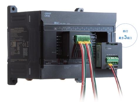 CP2E可通过安装选项板使用最多3个串行端口。因此,可满足为装置运行状况和生产状况的可视化而增加外围设备的需求。
