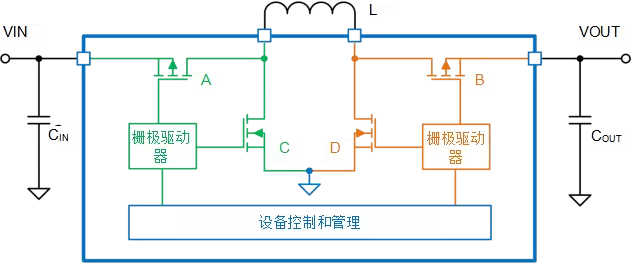 降压-升压转换器将降压转换器(图1中的绿色部分)与升压转换器(图1中的橙色部分)合并在同一结构中,从而可以有效地升高和降低输出电压。控制环路可以根据实际的输入电压和编程设定的输出电压来决定设备是否需要在降压或升压模式下运行。