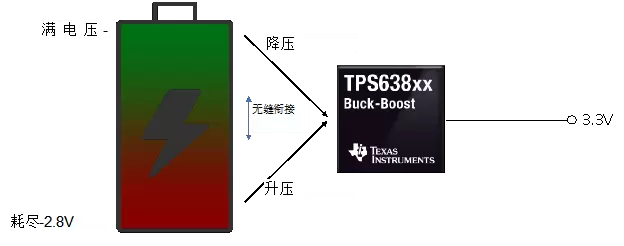 例如,假设要使一个典型电压范围为4.2V到2.8V的锂离子电池提供3.3V的输出电压,如果使用降压转换器,那么电池的截止电压必须大于3.3V,缺点则是无法有效利用电池中存储的电能。而降压-升压转换器有助于充分利用电池的所有电能,因为当输入电压等于或低于3.3V时,降压-升压转换器还可以消耗存储的电能,如图2所示。