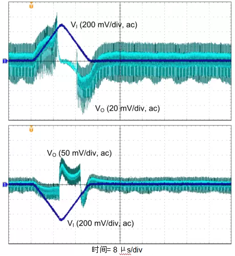 图3:TPS63802在VI = VO = 3.3V, ΔVI = ±0.5V时的线路瞬态响应