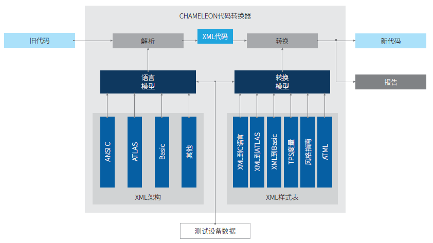 老旧硬件许多TPS采用ATLAS和Fortran等过时的汇编语言开发而成,ADVINT的Chameleon代码转换器可提供定制的自动化软件源代码转换,既可保护现有TPS投资,又可以迁移到新测试系统。该工具可根据特定应用编程需求,通过可定制且可扩展的XML语言翻译模型将传统编程语言转换为现代软件开发环境。