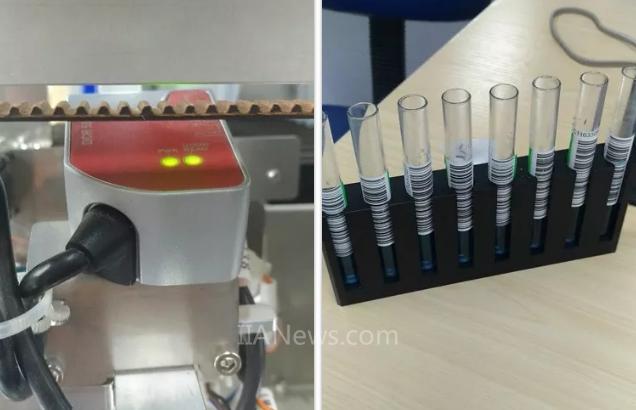 该项目使用一个DCR55读取样本上的条形码与试剂盒上的二维码,通过一个镜子将视野分成两部分,左侧读取条形码,右侧读取二维码。因为条形码的距离是30mm,通过镜子反射以后距离变成了60mm,满足了读取条件。但由于现场环境比较昏暗,针对读码和解码的难度也同时加大,在排查后重新调整了扫码器的安装位置与拍照的设置,并配置了扫码器的拍照参数后读取效果非常成功。
