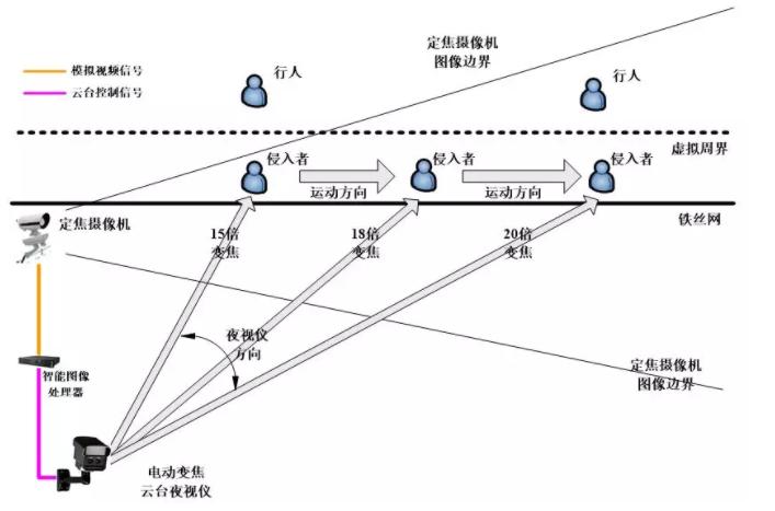枪机+球机接力布防:由枪机监控整个场景,当检测到有入侵目标时,即启动球机对该目标进行自动跟踪,而枪机还在监控整个场景。当有多个目标侵入时,不会因为球机的自动跟踪而暂时丧失安防功能。