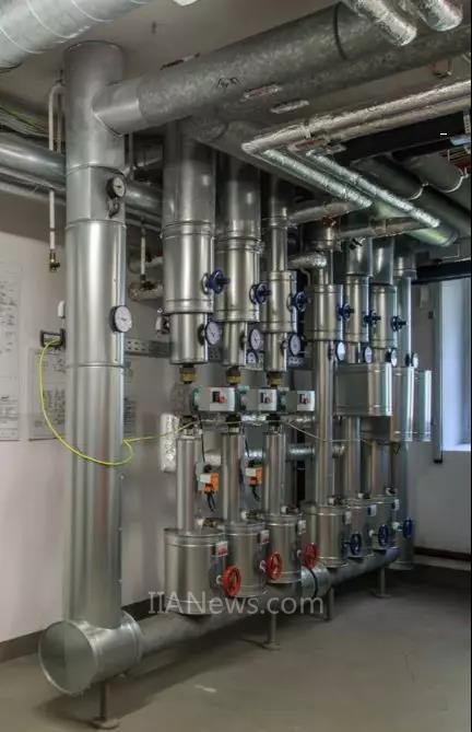 该系统配有高效旋转散热器,在供暖运行中热回收率大约为75%。空气湿度由下游加湿箱的独立蒸汽机产生。然后通过建筑物的主管道将空气传送到第一层和上一层之间的地面区域,然后再通过管道传输到展览室。