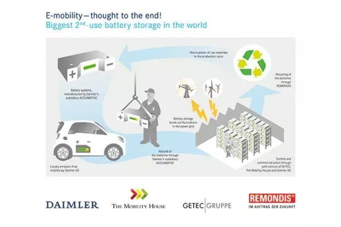 2015年,戴姆勒与The Mobility House、GETEC Energie两家公司达成合作,并成立新的合资企业,意在提升电池二次利用率及抢占储能电池市场。当时打造的储能电站容量13MWh,储能装置全部采购退役的smart动力电池。