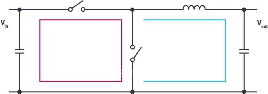 开关稳压器中需要不断开关电流。这些电流通常比较大。每当电流流动时,会产生磁场。如果快速开关大电流,就会产生交变磁场。此外,如果开关电流时,路径中存在寄生电感,就会产生电压失调。电流会容性耦合到相邻的电路部件中,并增加电源的噪声辐射。综上所述,我们可以说开关电流是导致开关模式电源产生噪声的主要原因。图1显示了简化的降压转换器拓扑结构。所有存在连续电流的线路都用蓝色表示。所有快速开关电流的线路都用红色表示。