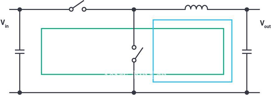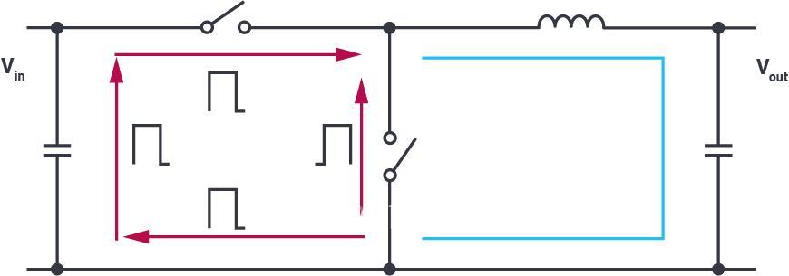 图1中的红色线路是关键线路。它们看起来像一个电流回路,因此被称为回路。热回路意味着这个回路特别关键,因为它涉及到快速开关电流。如果我们仔细观察这个回路,可以看到图1中的红色回路从来没有真正的电流流过,这个因为两个开关从来不会同时打开。它只是单条线路的组合,在特定时间会有电流流过,在其他时间则没有电流流过。在图2中,各连接线路旁的箭头表示电流流动的方向。同时,通过指定的符号表示电流流过的时间。在其他时间,没有电流流经该导体。