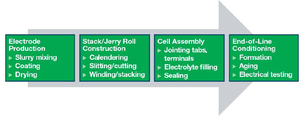 图1显示锂离子电池制造过程。下线调理步骤中的电池化成和测试不仅是工艺瓶颈,还会对电池寿命、品质和成本产生极大影响。