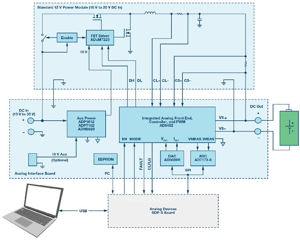 开关电源可为现代可充电电池的制造提供高性能、高性价比解决方案。AD8452可以简化系统设计,系统精度优于0.02%,能效比高于90%,并且支持能量回收功能,与那些浪费放电电能,而不重复用于为其他电池充电的系统相比,可以节省超过40%以上的能源,有助于解决可充电电池制造瓶颈问题,并且让混合动力汽车和电动汽车从生产过程开始就环保友好。