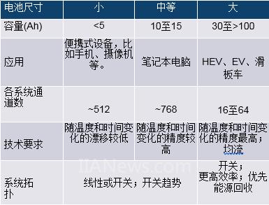 混合动力汽车中使用的大量电池都必须完美匹配,这便提出了更为严格的精度要求,使得开关拓扑成为极具吸引力的选择。表1显示各类电池单元的功率容量和最终功能对比。